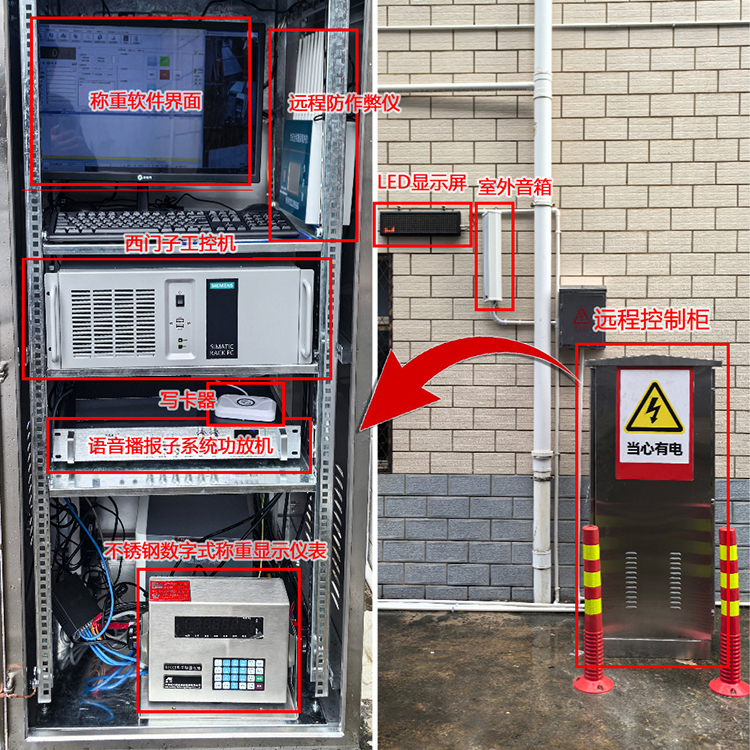 前端称重设备包含:刷卡箱带微型打印机、车牌识别仪、智能道闸、红外对射电子围栏、LED显示屏、语音播报系统、远程控制柜(含西门子工控机、电脑、数字式高精度称重显示仪表、写卡器、功放机、防作弊器及稳压器)等。